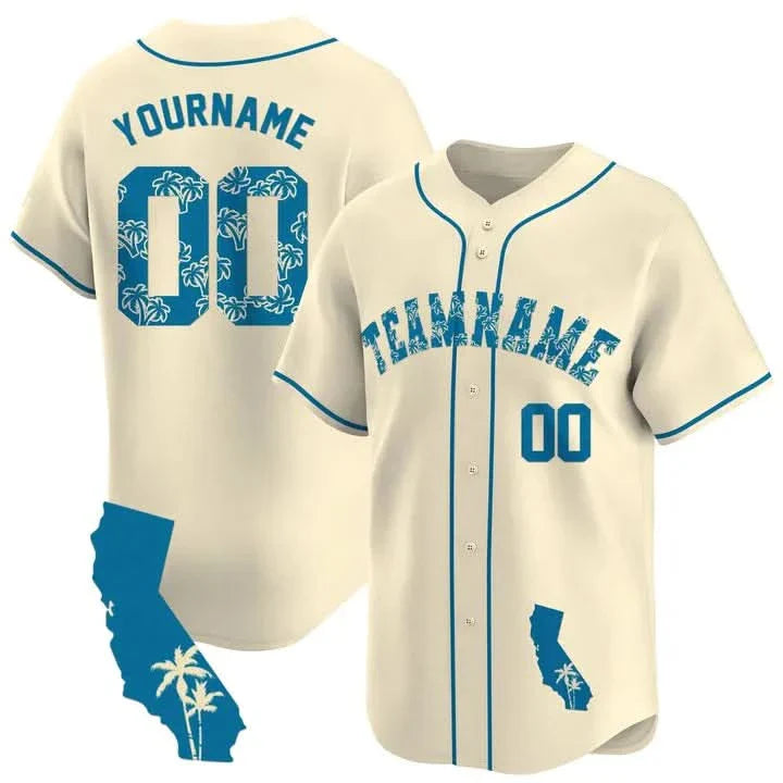 CUSTOM CREAM BLUE PALM TREES CALIFORNIA MAP BASEBALL JERSEY - EMBROIDERED