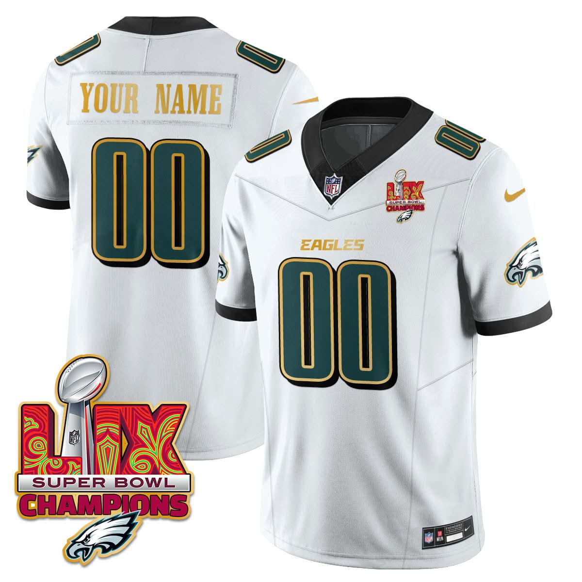 Custom Name/Gender Philadelphia Eagles Super Bowl LIX Champions Gold Trim Vapor Limited Jersey - All Stitched