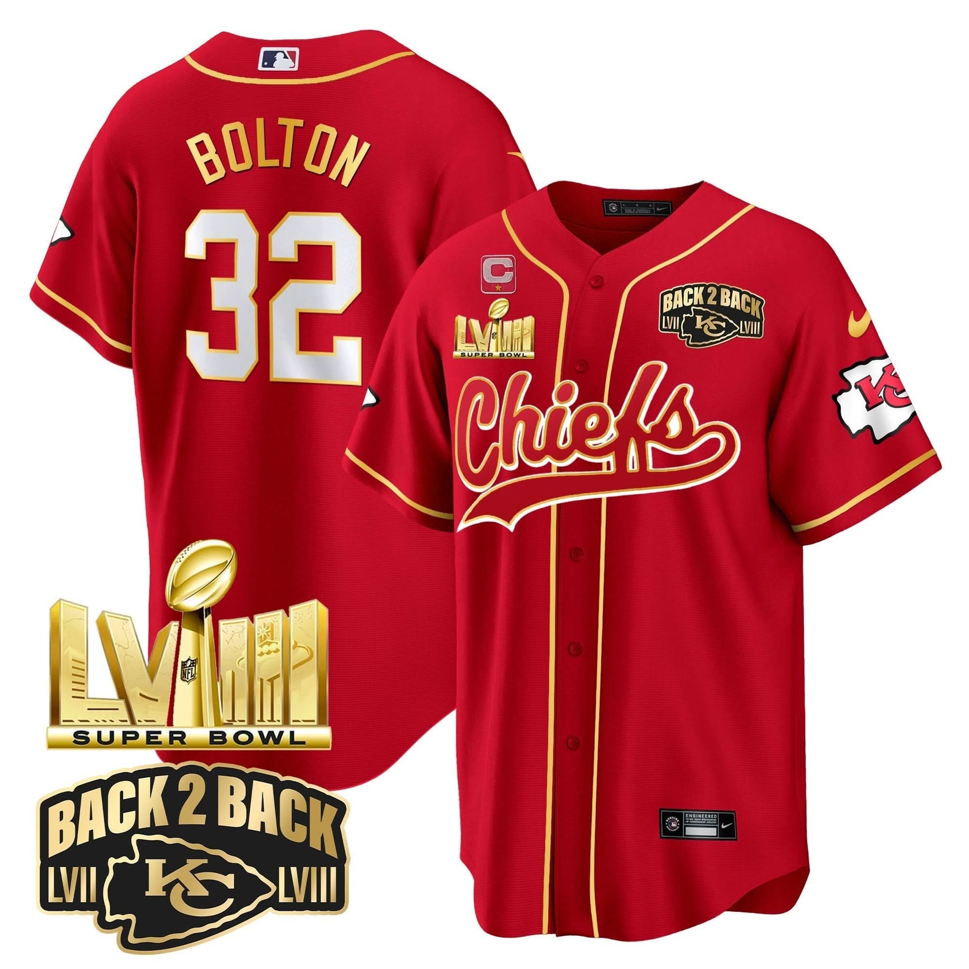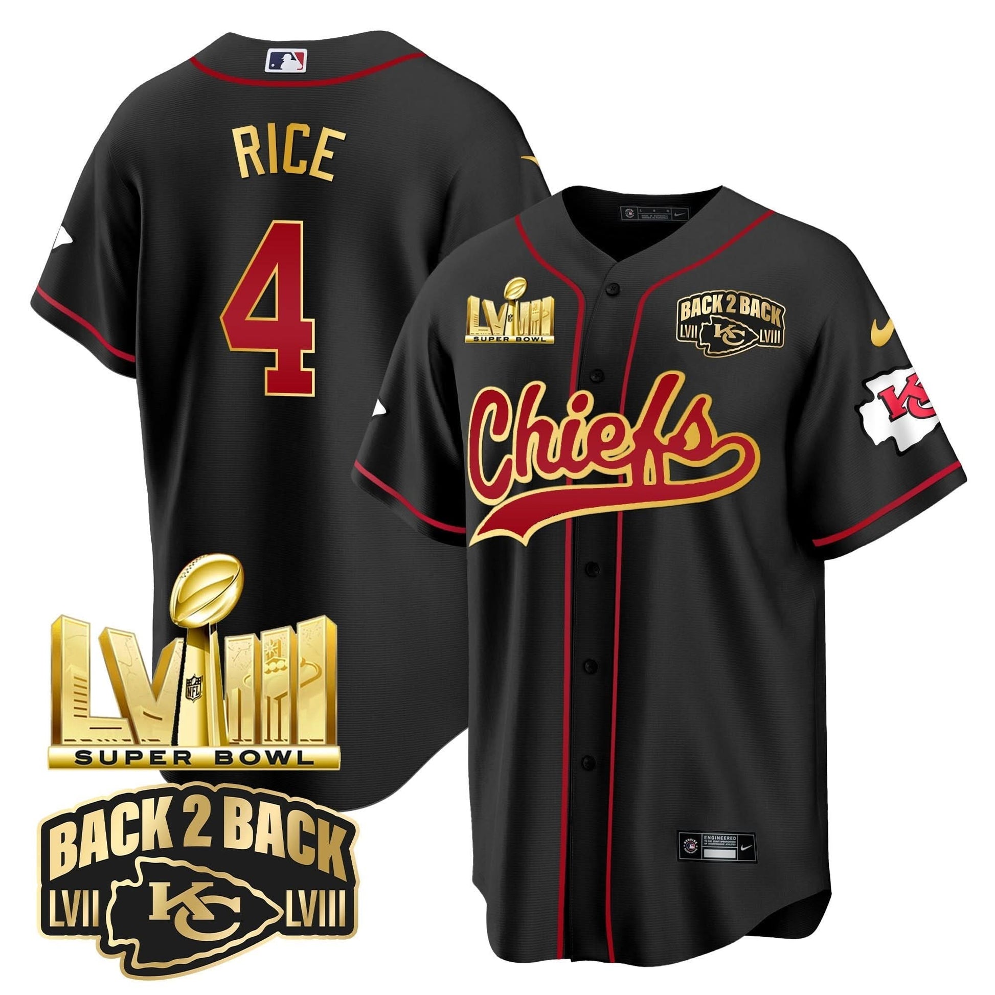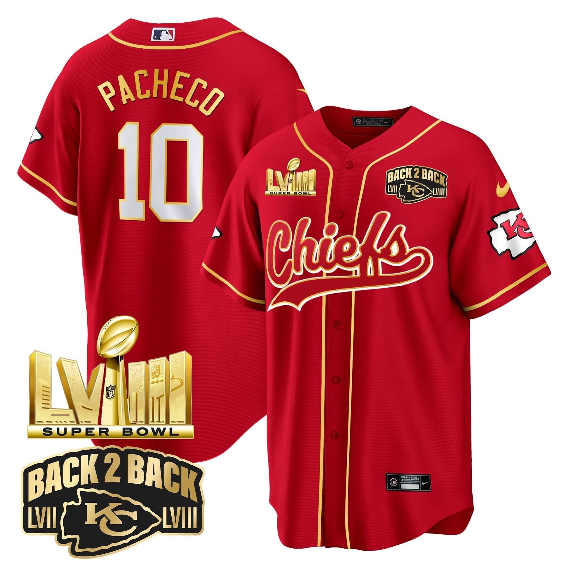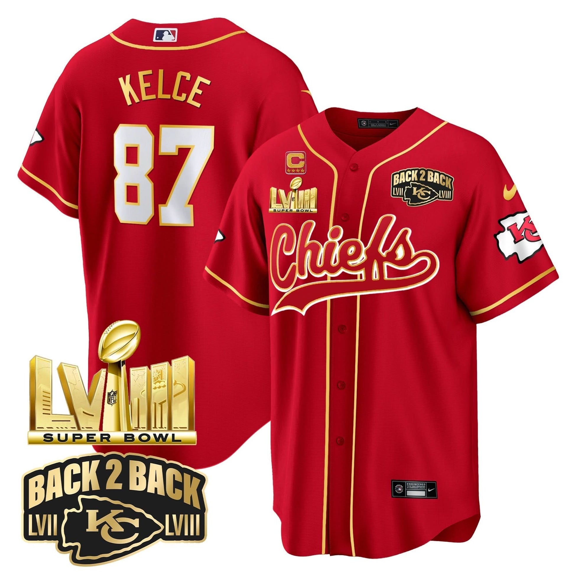 Chiefs Super Bowl LVIII & Back 2 Back Gold Patch Baseball Jersey - All Stitched